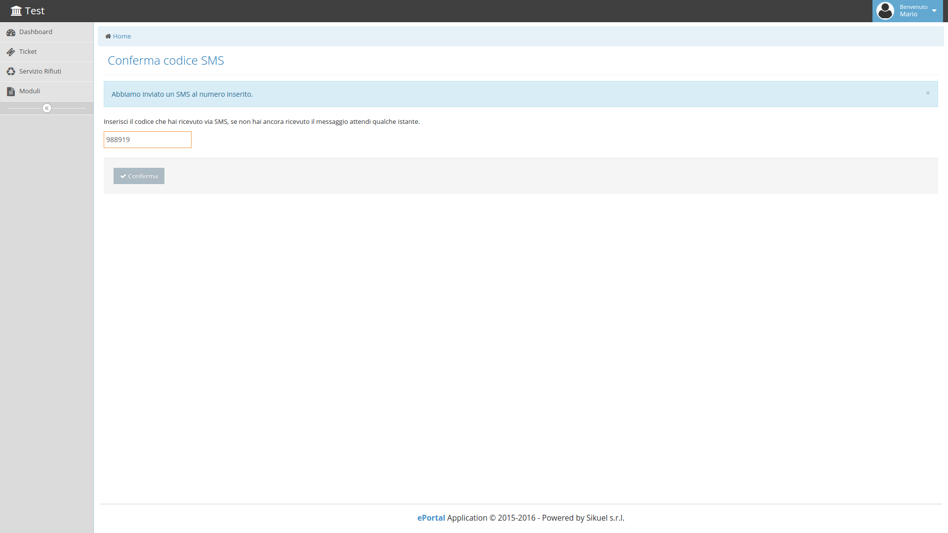 Verrà inviato un SMS al numero inserito, con un codice da inserire nella successiva schermata